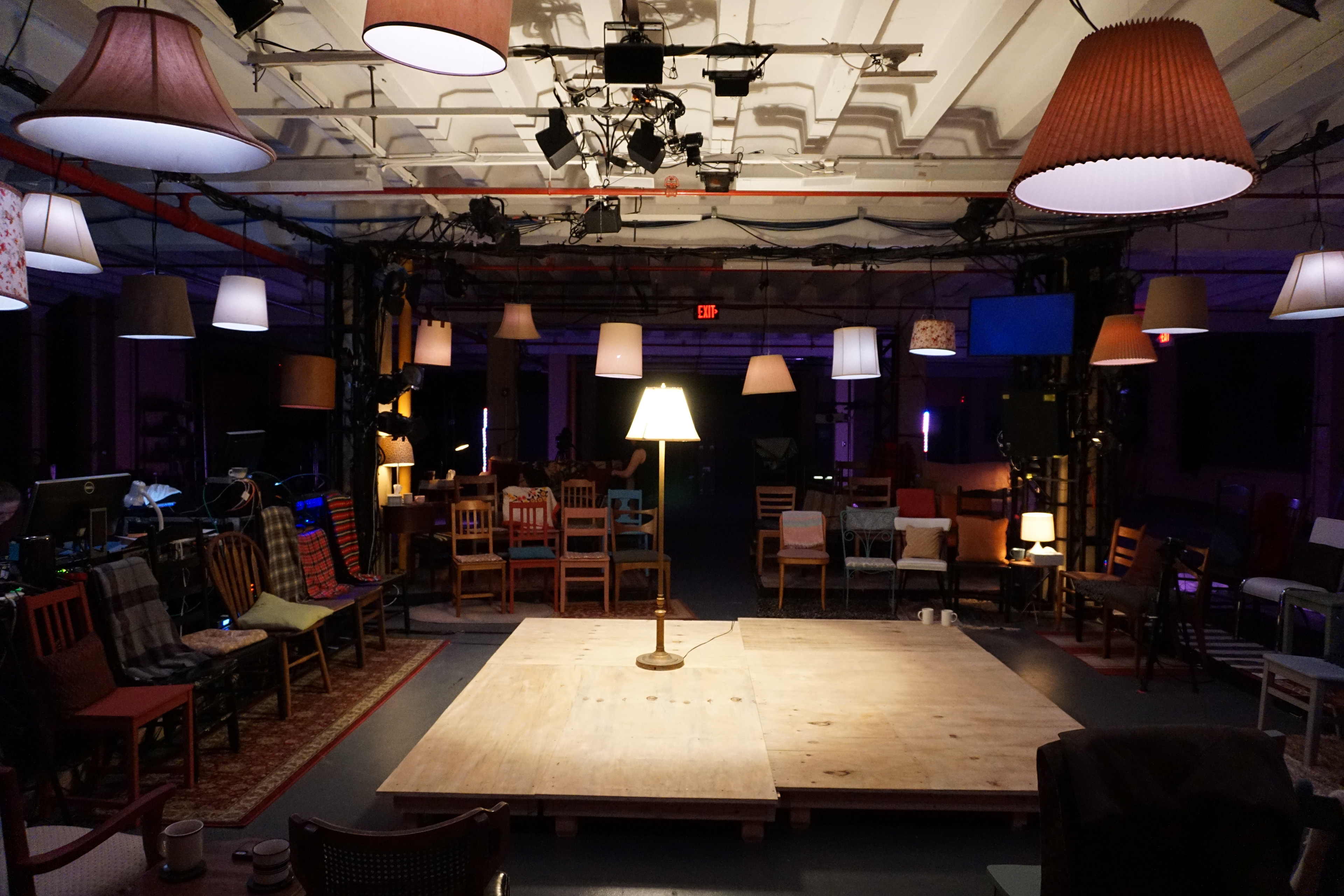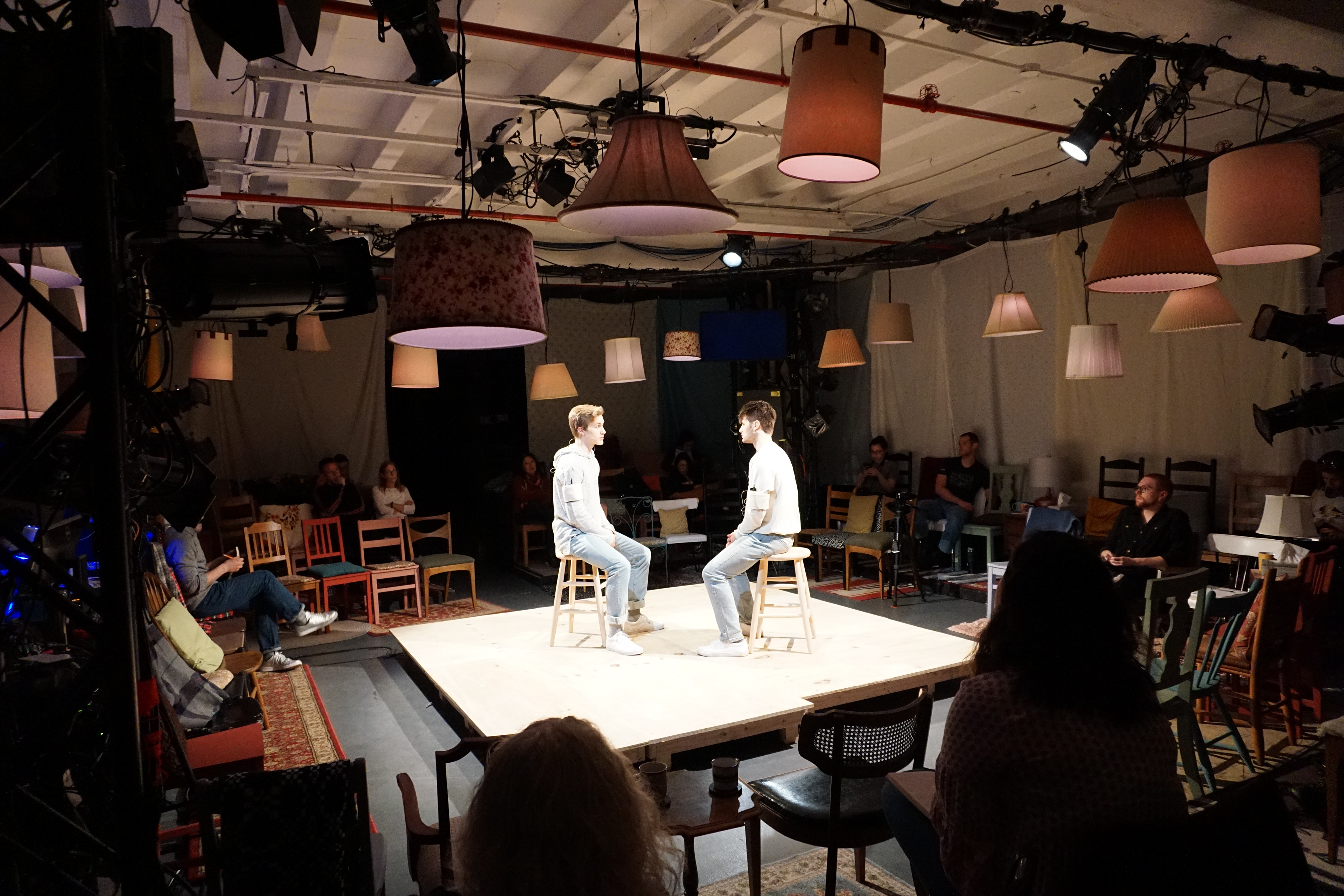 A New Work written by fellow student Eben Hoffer exploring mental health at Carnegie Mellon. The play consists of a non linear reflection of many student's testimonies and experiences in regards to many things like depression, anxiety and racial profiling. Each actor wore an in ear piece where they listened to the recordings of student's testimonies and told them to the audience in real time as they hear it. The performers were not to play the students. They were simply vehicles of the testimonies. As such their costumes were as simple as simple can be and played into the color palette of the stage. The combination of washed out clothing and unfinished wood was so light in contrast to the audience the playing space seemed to glow in comparison.